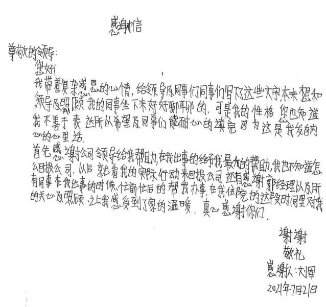 经过半个月治疗休养,刘军手部已无大碍。出院后的他写了一封感谢信并为公司送了一面锦旗,他说道,是星空官方端网站入口-星空(中国)这个大家庭让他感受到了关怀和温暖,他表示要把这种关怀变成工作上的动力,争取早日返回工作岗位,努力工作,回报大家的关心和关爱。